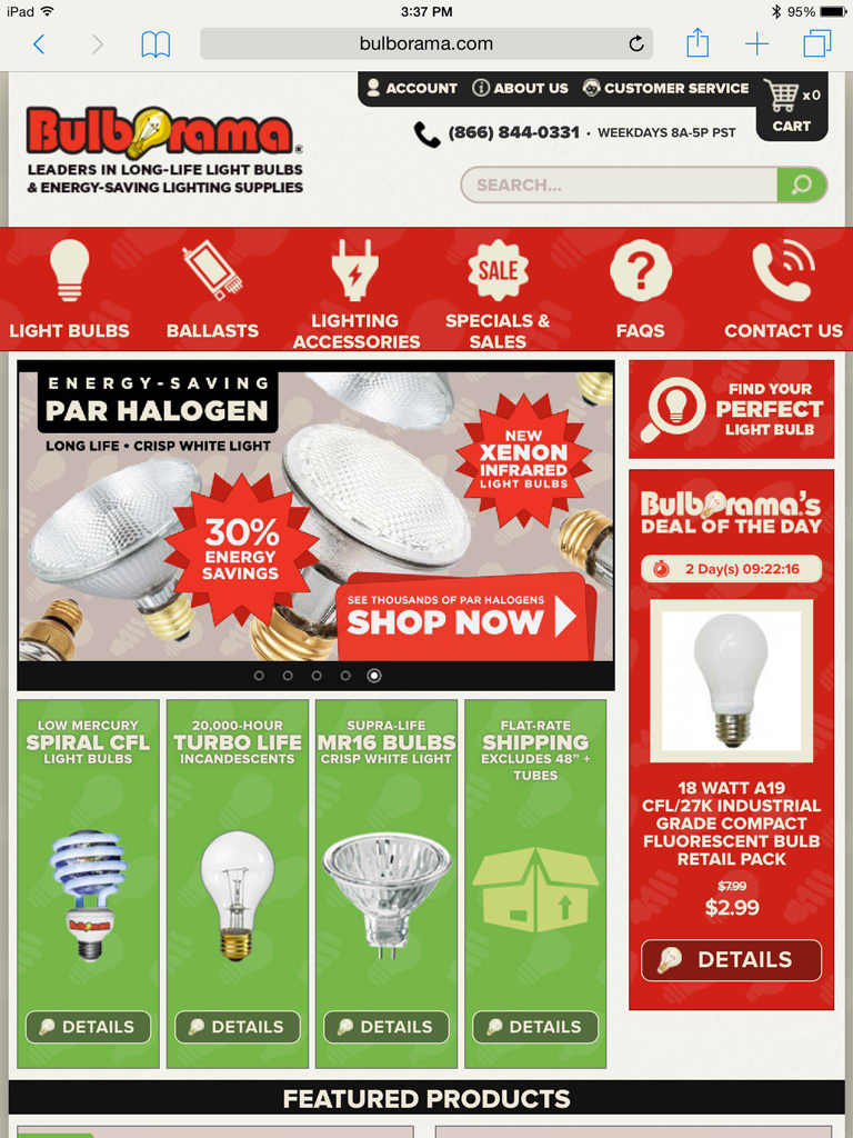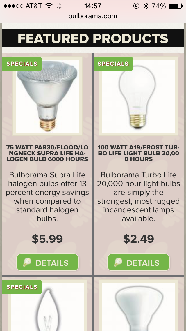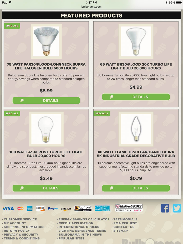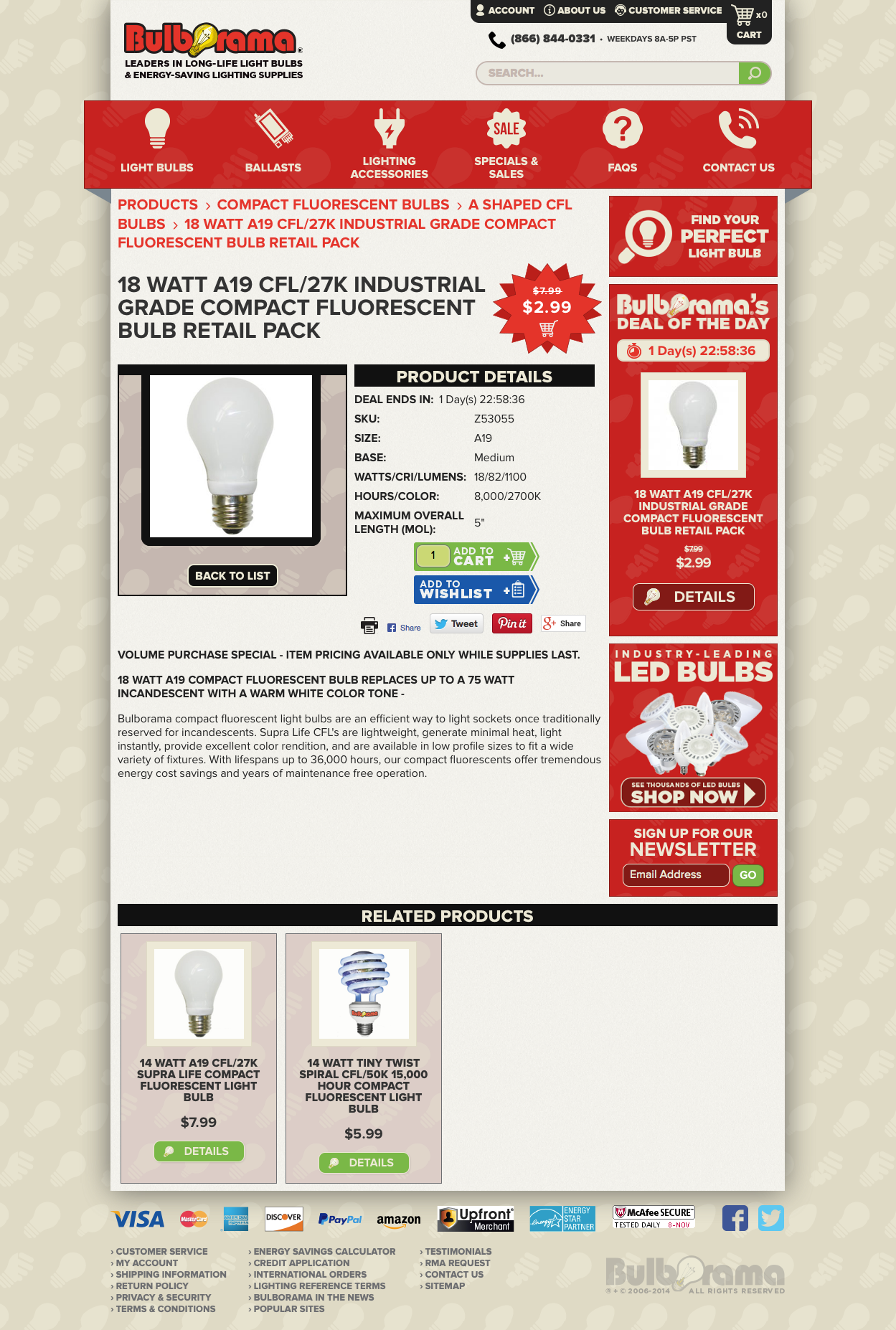 Bulborama is a leader in long-life light bulbs and energy-saving lighting supplies, based in Las Vegas. Redesigned and implemented design atop their hosted e-commerce platform, called CoreCommerce. Much additional work was done (and unfortunately extra JavaScript) to ensure proper responsive design.