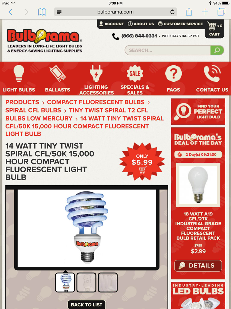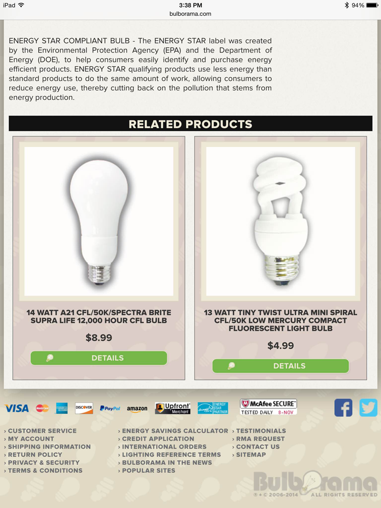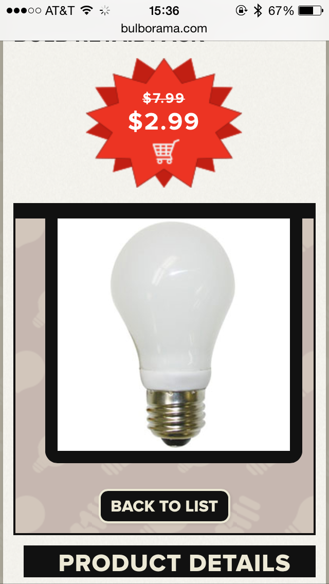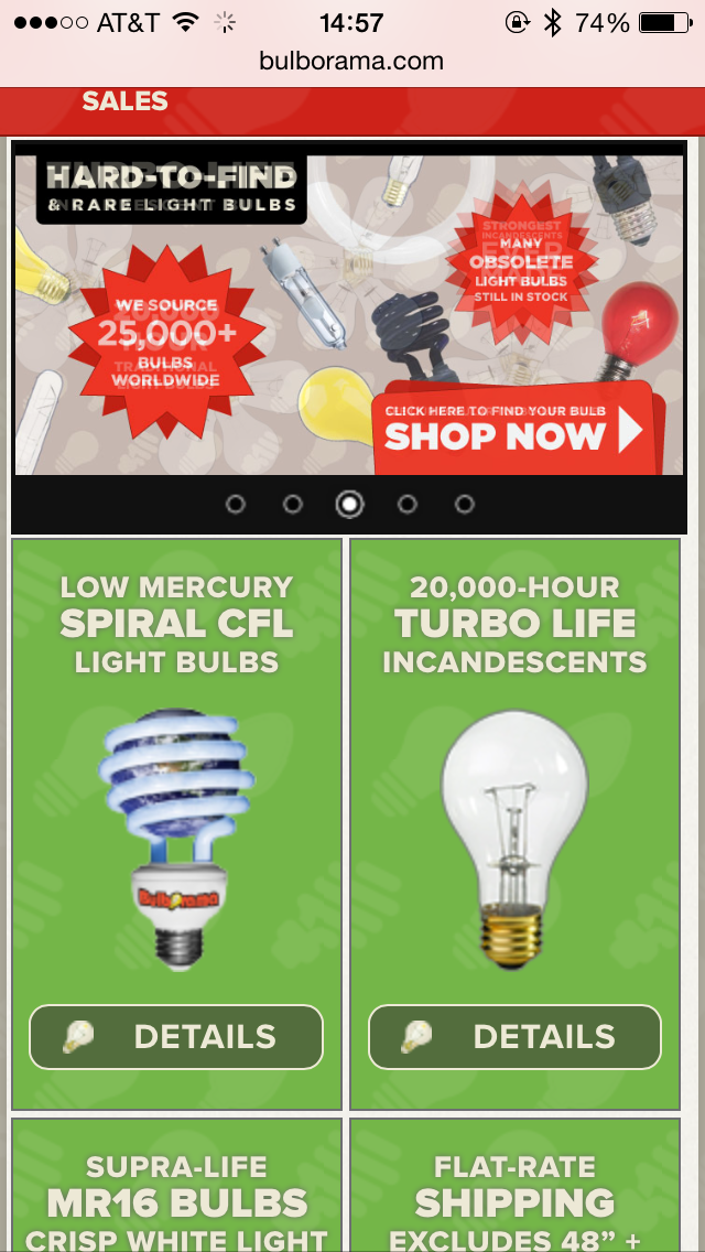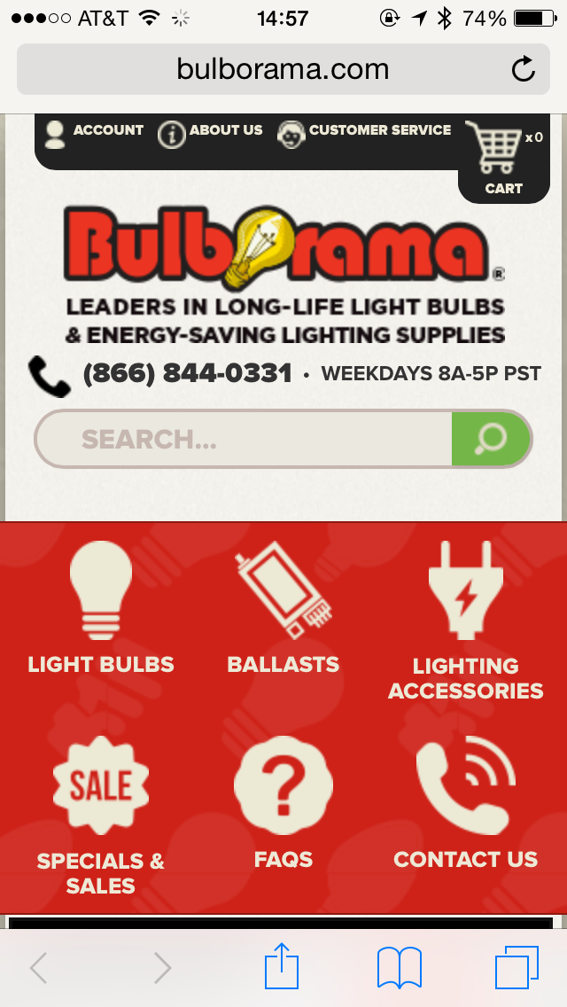 Bulborama is a leader in long-life light bulbs and energy-saving lighting supplies, based in Las Vegas. Redesigned and implemented design atop their hosted e-commerce platform, called CoreCommerce. Much additional work was done (and unfortunately extra JavaScript) to ensure proper responsive design.