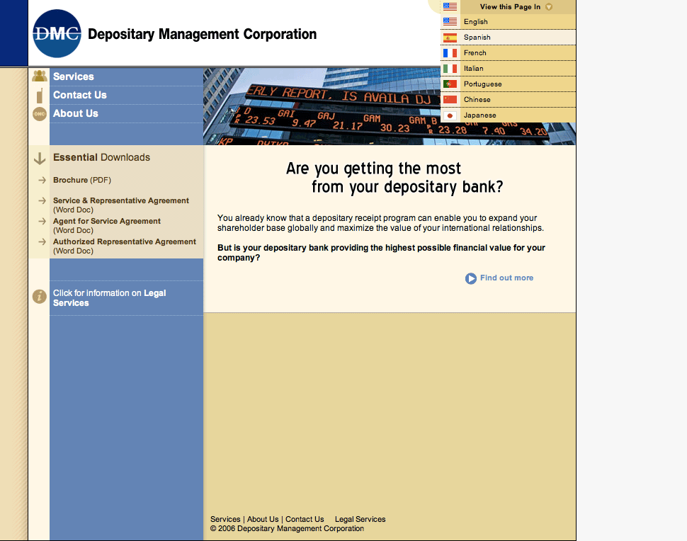 A premier provider of depositary receipt services. Designed and developed a language-agnostic website, utilizing seven language translations. Adapted branding from a given brouchure.