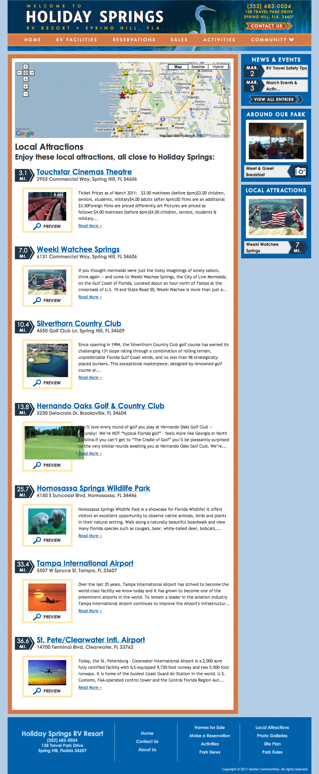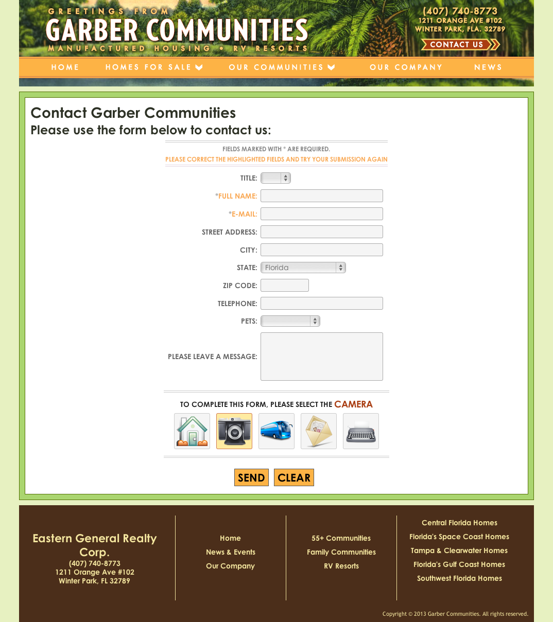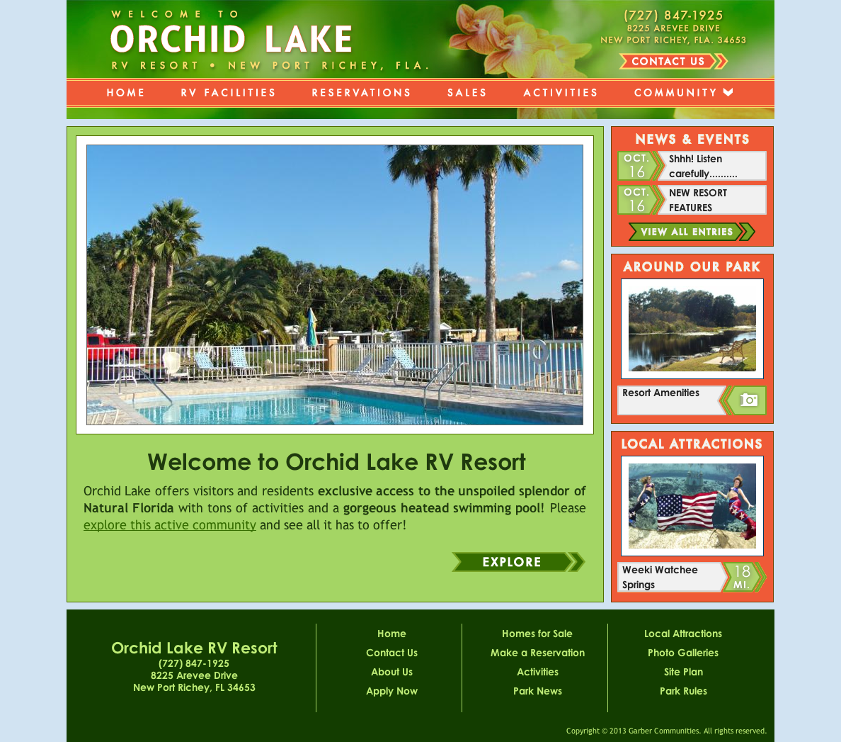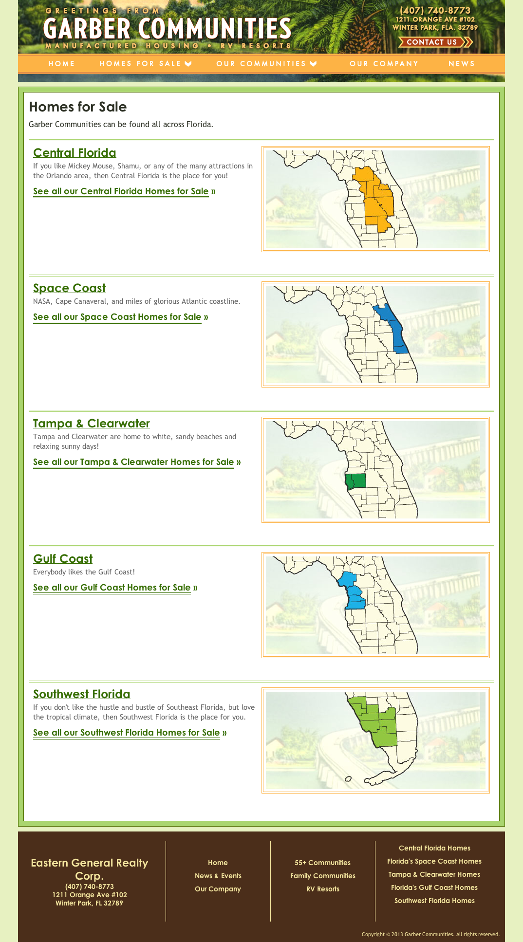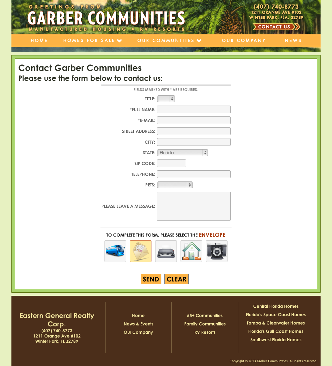 A leading real-estate company based in Orlando, specializing in manufactured housing and RV Resorts. We made a site for each of their 12 parks, all using a common, proprietary framework and content manager, before completing their main site. The contact form also uses our revolutionary anti-spam technology, called Pictcha.