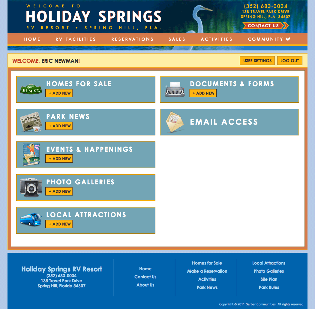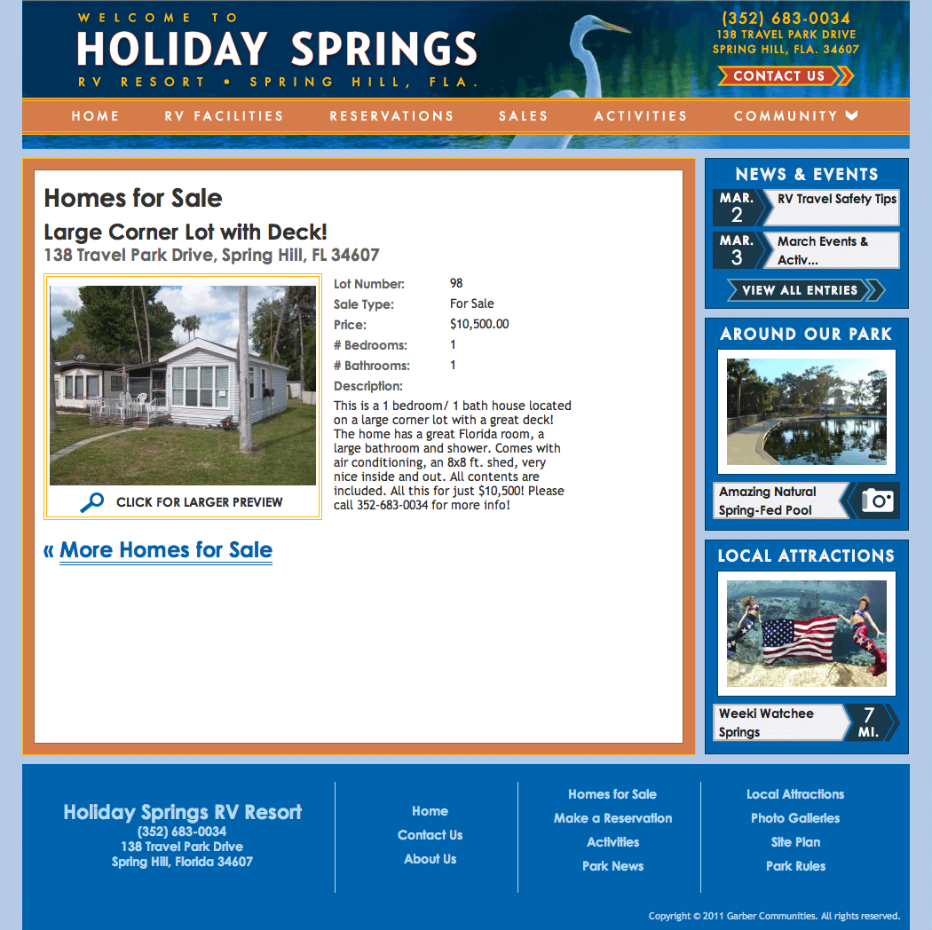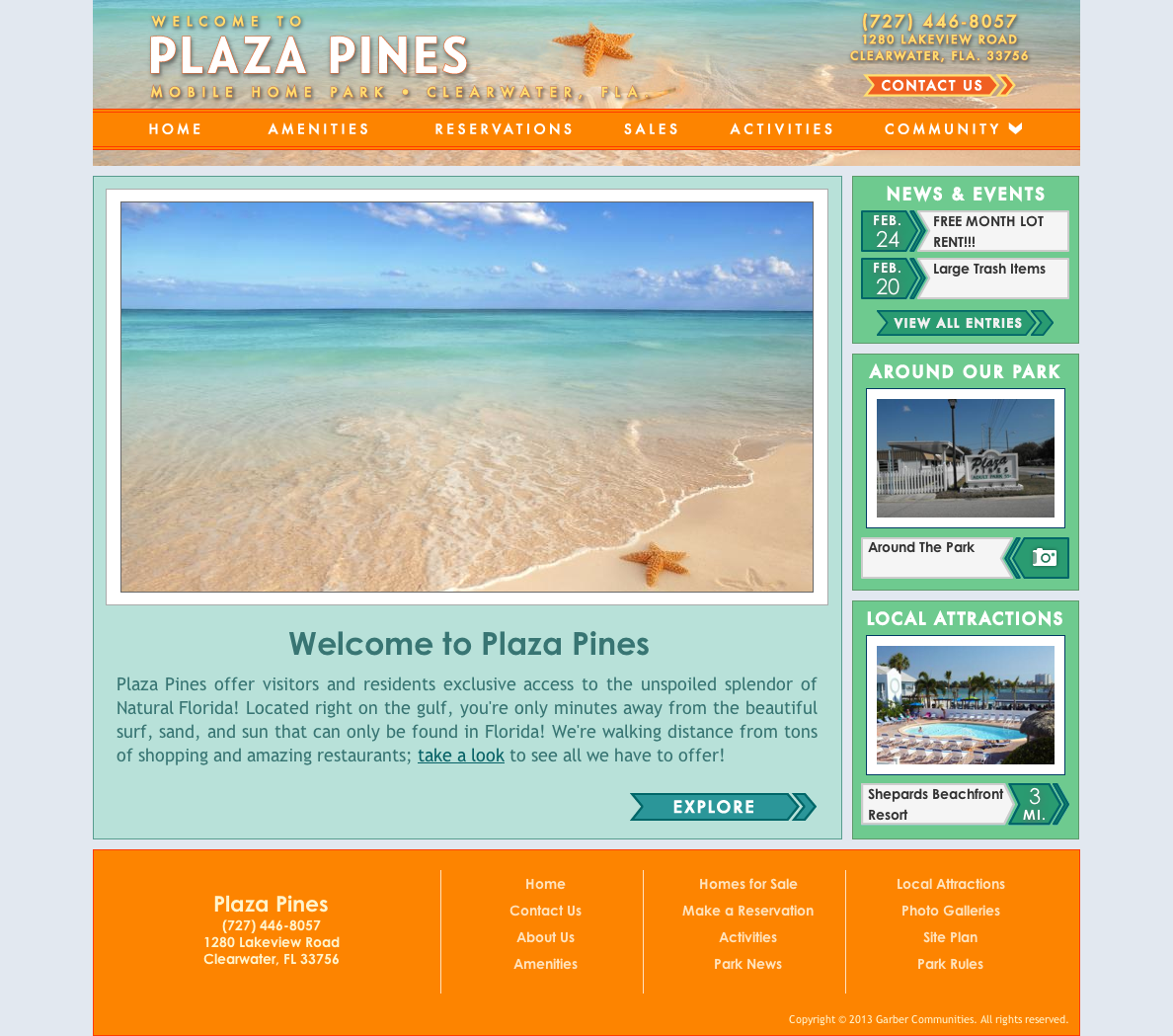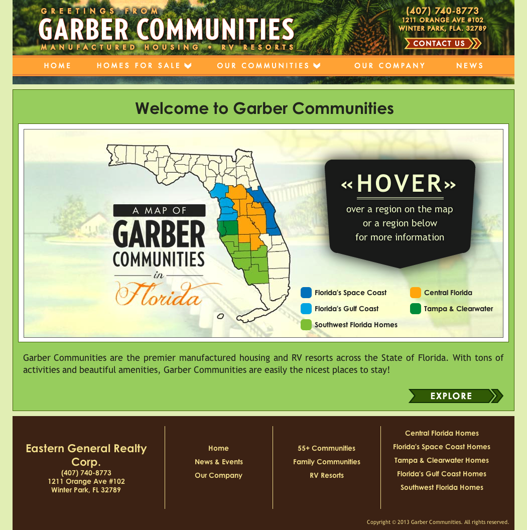 The flagship site of a series prepared for Garber Communities, this site has an administration area for managers to list properties for sale, park news/events, and much more. All sites in this series run off of a common proprietary framework, “Nimbus”, to minimise duplicated code.