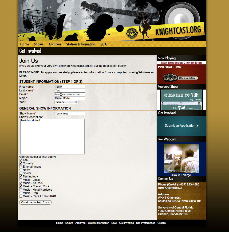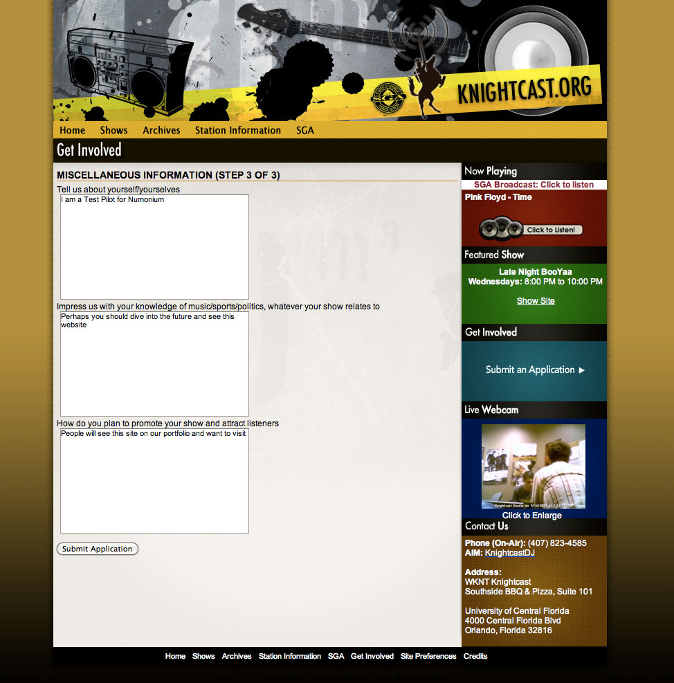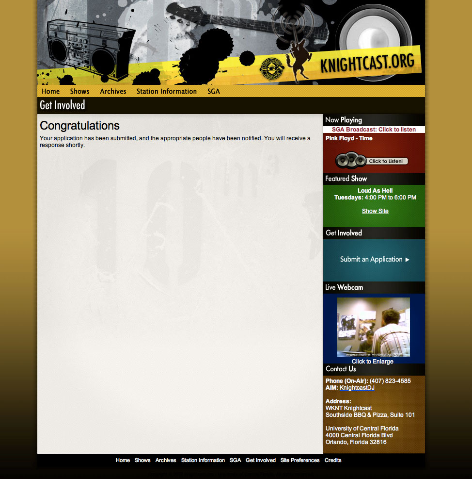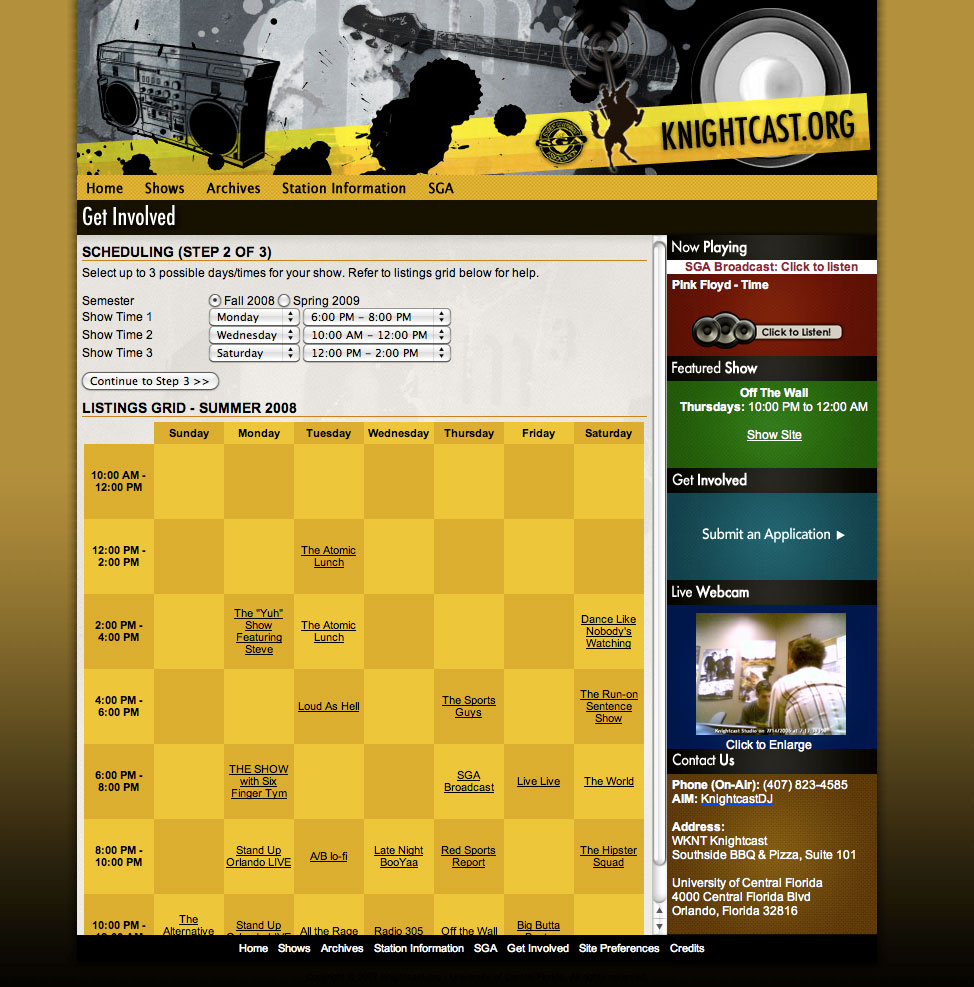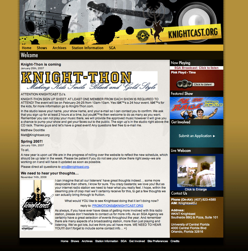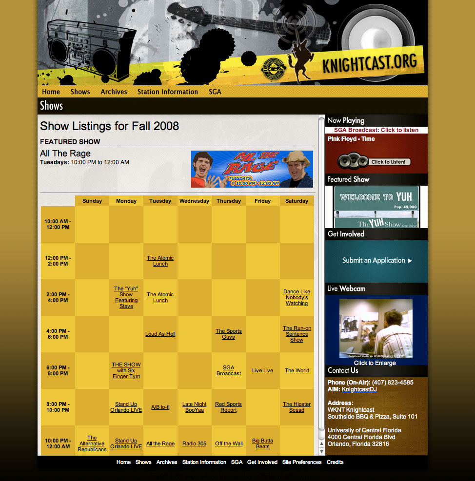 An Internet-based student-run radio station in the University of Central Florida. Performed all design, development (including CMS), network setup, and administration. All show information was input via a proprietary CMS. Scheduling and listings grid were generated dynamically.