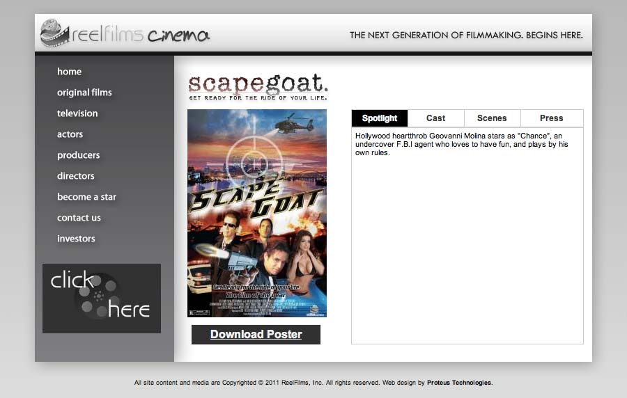 A next-generation independent film studio, specializing in high-intensity action thrillers. Designed all branding, all aspects of Internet presence, online application engine, proprietary CMS and introductory movie. In 2005, we were known as “Proteus Technologies”.